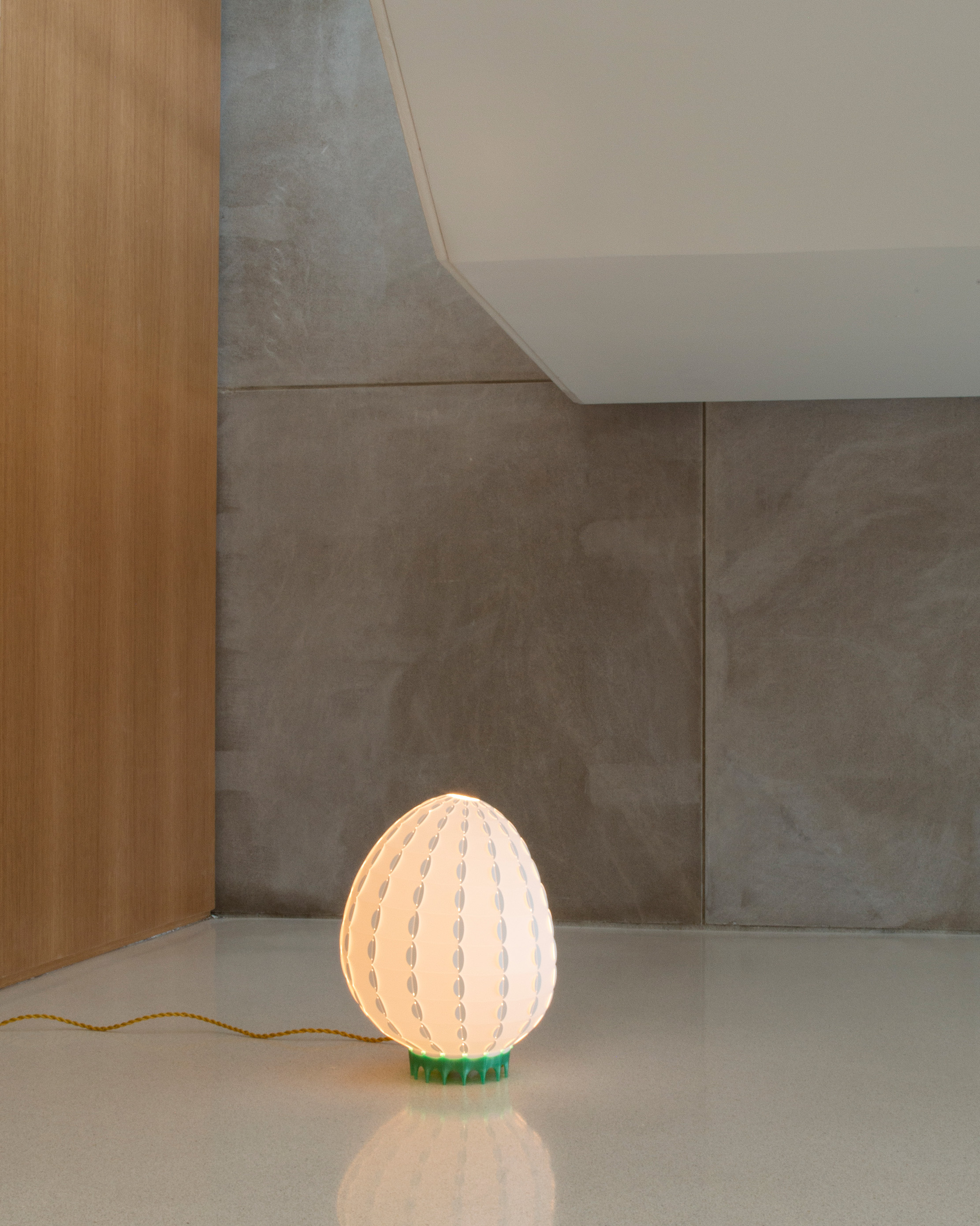 Signature tabbed inserts create a light-shadow interplay, becoming both structure and ornament. Flat-packed and assembled without hardware or glue, each lamp is generated from a custom parametric system, allowing for diverse forms through flexible connection geometry and a shared standard socket base. The result is a luminous, otherworldly object—part botanical, part digital—floating between nature, fantasy, and futuristic design.
